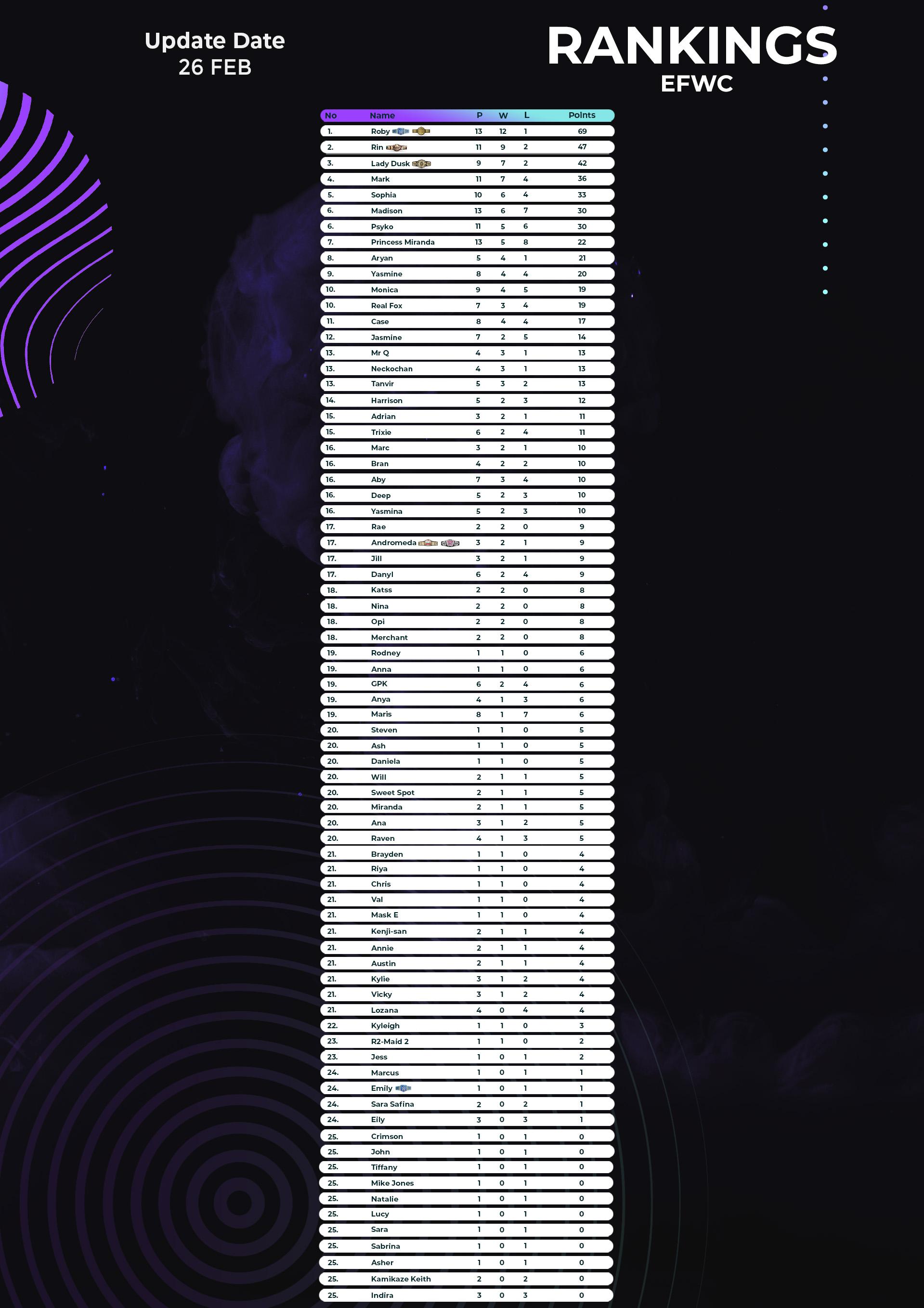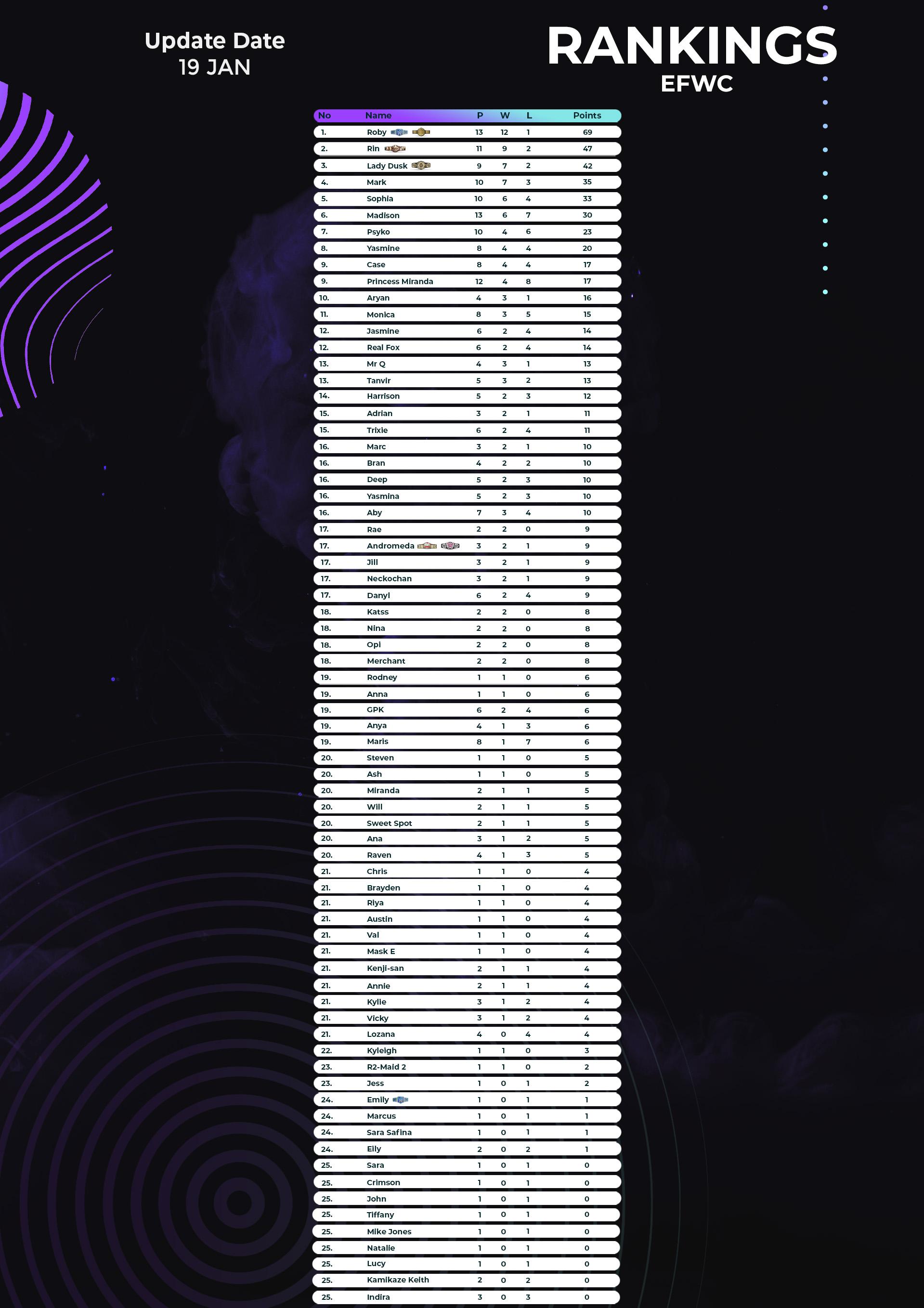 Each match shared in the EFWC will be worth points to establish a ranking. Those in first place will have more chances to fight for the belts and take part in our tournaments.