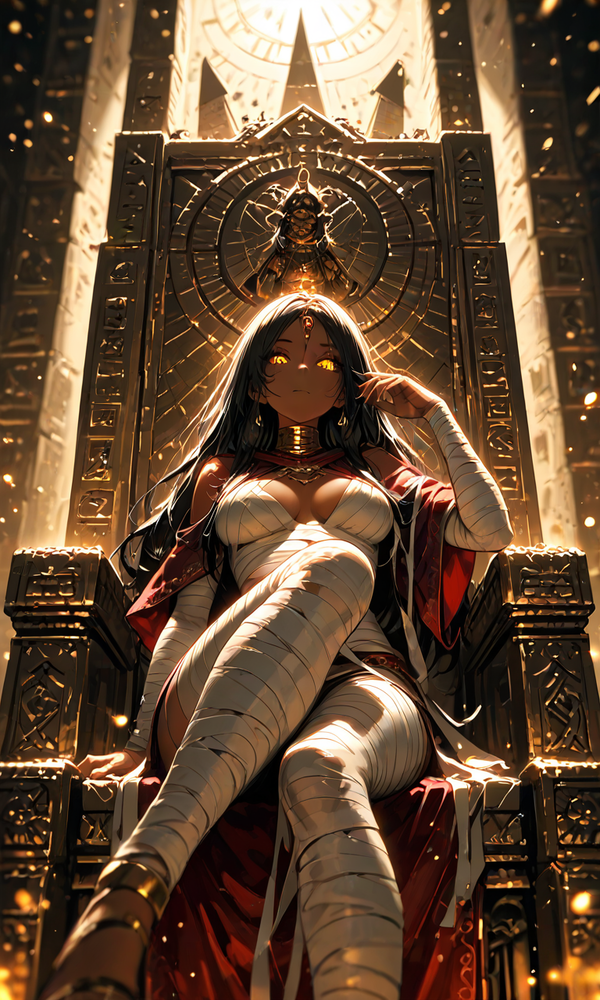 Wrapped in ivory bandages like silk, gold catching every flicker of light. A deep red cloak flowing behind her like blood in water. Long black hair, darker than the booth shadows, and these glowing golden eyes that looked right through you.