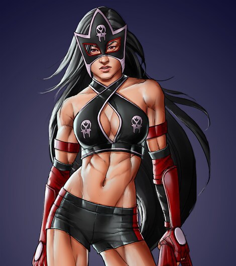 As the blinding light shuts off, she appears in the middle of the ring, flexing her tall bulky body, flaunting her sexy curves to the booing audience and her terrified opponent...