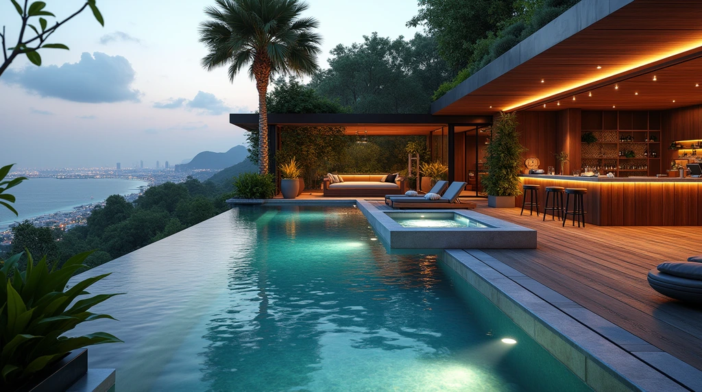 The rooftop of The Velvet Estate is a breathtaking sanctuary where luxury, nature, and entertainment converge. A shimmering infinity pool glows with amber LED lighting, its edge seemingly spilling into the city and ocean horizon, while a bubbling Jacuzzi invites quiet relaxation. Surrounding the water, lush tropical plants, palm accents, and fragrant citrus trees create a verdant oasis, complementing the sophisticated rooftop bar with its polished counter, ambient lighting, and elegant seating. Plush daybeds, lounge chairs, and soft cushions are arranged throughout, offering spaces to unwind, socialize, or simply take in the panoramic views. The combination of water, greenery, and refined design creates a cinematic, immersive atmosphere — a serene yet luxurious retreat that feels both private and expansive.