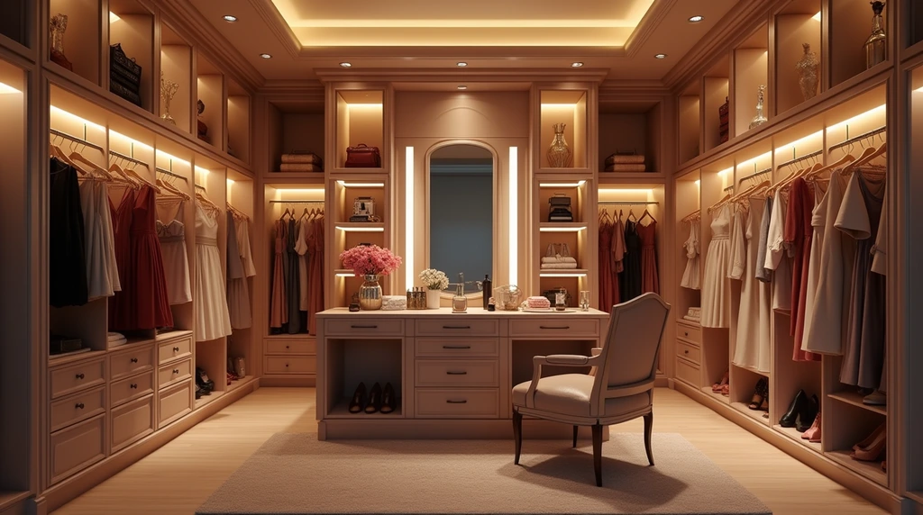 The Walk-In Glam Suite at The Velvet Estate is a luxurious haven where style, elegance, and meticulous organization converge. Expansive, color-coded wardrobes showcase designer dresses, lingerie, and accessories, each piece thoughtfully arranged by hue and style, while soft ambient lighting casts a flattering glow across polished wooden floors and reflective surfaces. At the heart of the room, a central vanity stage features a large mirror, professional lighting, and a sleek countertop adorned with carefully arranged makeup, brushes, and styling tools, perfect for photoshoots or personal styling sessions. Plush seating and subtle decorative accents enhance both comfort and sophistication, creating an atmosphere that is simultaneously functional and opulent. Every detail of the suite exudes glamour and refinement, offering a cinematic space where fashion, beauty, and luxury are celebrated in perfect harmony.