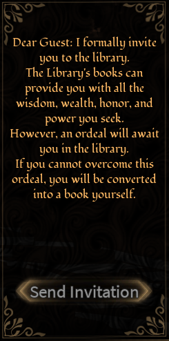 Guests will receive an invitation, should they sign it, they will be brought here. Here, they may find a book posing an answer to whatever question they might have, a book no other library could.
